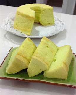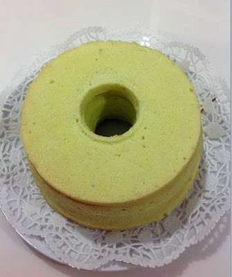 蛋黄 4个糖 15g盐 一小撮植物油 60g自制pandan汁 70g低筋面粉85g(我用特幼面粉)粟粉15g (jagung 粉)(混合过筛)蛋白 4个(160g)柠檬汁 1tsp糖 75g(我放65g微甜)做法:1。 蛋黄 + 盐 + 1/3细砂糖,搅拌至顺滑。2。 蛋黄糊中加入油搅匀,加入pandan汁,再加入粉类拌均匀。3。 蛋白打至起泡后加入柠檬汁和糖(糖分三次加入)打至硬性发泡。4。 先挖1/3蛋白霜加到蛋黄糊中,拌均匀,再加另1/3蛋白霜到蛋黄糊中,拌均匀,最后将蛋黄糊全部倒入剩余的蛋白霜中,拌均匀5。 将拌好的糊倒入模中,在桌子上震出大气泡。6。 烤箱预热,在蛋糕糊装入模后即时以 150 度烘烤 45 分钟。